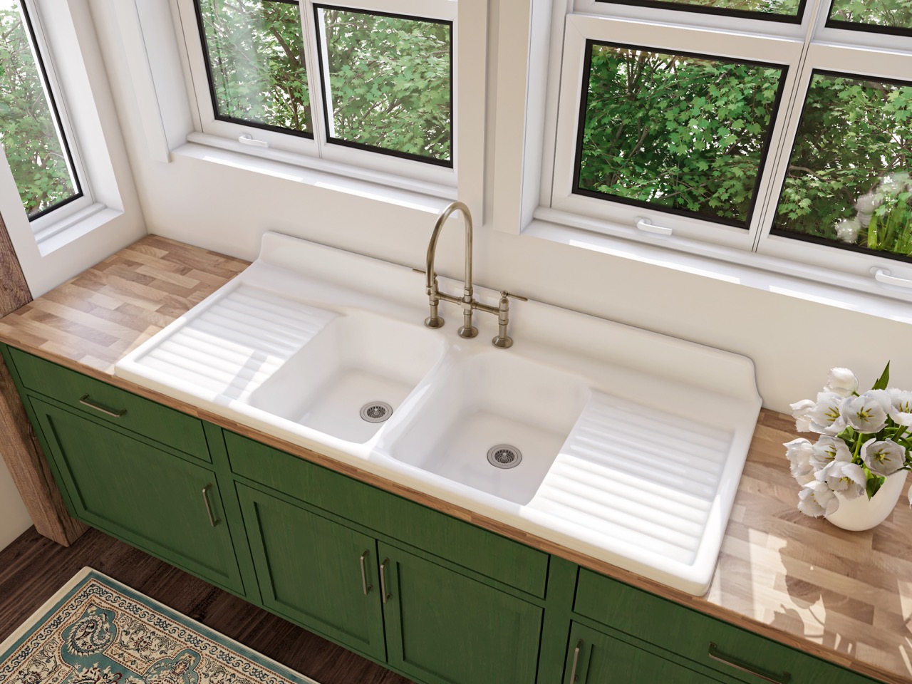 I love my double drainboard sink so much! It is so crisp and clean, and because we have butcher block counter tops, the double drainboards give us lots of room for wet things while protecting the countertops. If we ever move I’ll have to take the sink with me! Love it!!