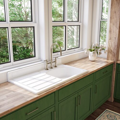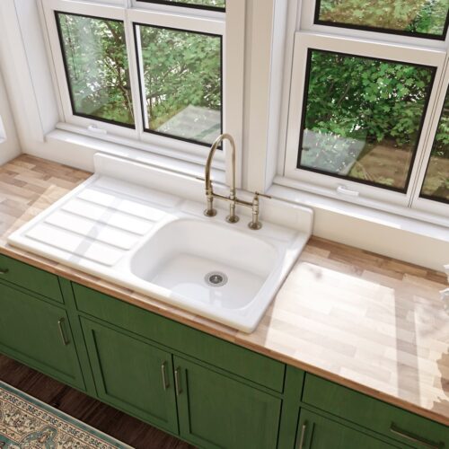 Our first sink arrived damaged (obviously the fault of the shipping company) and NBI could not have been better about sending us a replacement ASAP so our kitchen remodel project wouldn’t be delayed. So, kudos to NBI for amazing customer service, and also for making such a gorgeous reproduction sink. It is the star of our new kitchen. FYI for anyone with a tiny kitchen: an 18″ dishwasher will fit PERFECTLY under the drainboard portion of the sink. (19″ from the edge to the beginning of the bowl measured from underneath) So happy!
